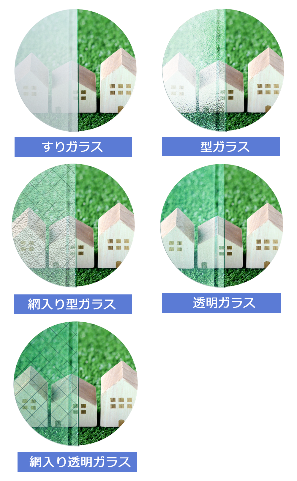 受付時にオペレーターがお聞きしますが、ペアガラスや防犯ガラスなどの複層ガラス(2枚のガラスがセットになっているもの)や特殊ガラス以外は、ほぼ上記5種類のガラスです。ガラスの中に網(ワイヤーが入っているガラス)が入っているかの確認をお願いします。