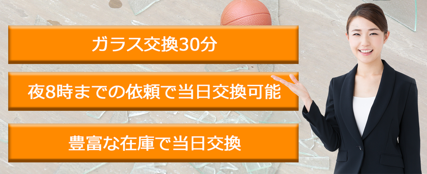 弊社のガラス修理は夜8時までにお電話をいただければ当日中の修理・交換ができるので安心です