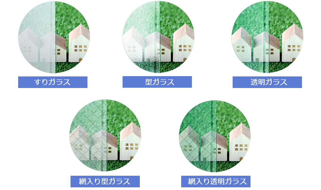 受付時にオペレーターがお聞きしますが、ペアガラスや防犯ガラスなどの複層ガラス(2枚のガラスがセットになっているもの)や特殊ガラス以外は、ほぼ上記5種類のガラスです。ガラスの中に網(ワイヤーが入っているガラス)が入っているかの確認をお願いします。